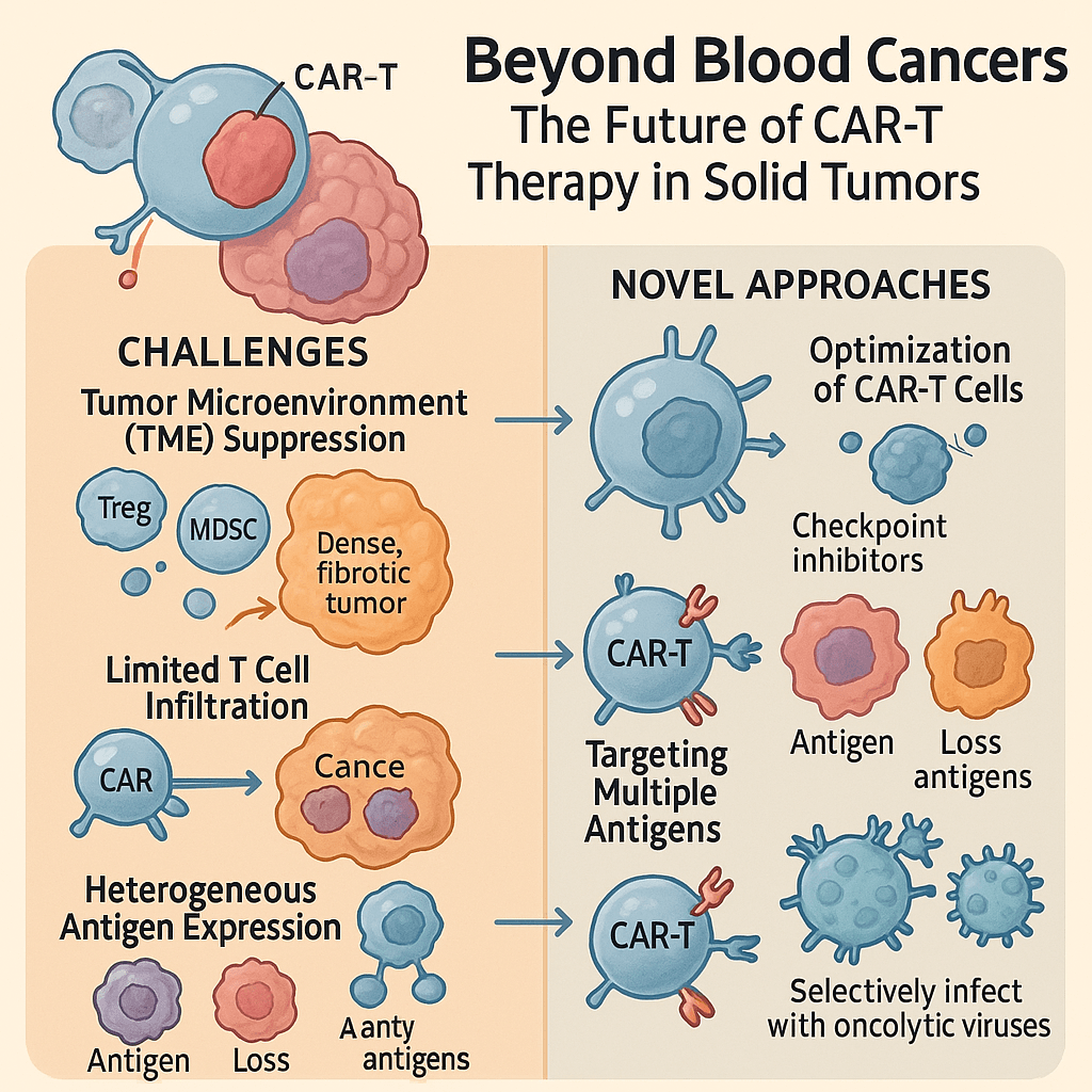 CAR-T cell therapy has revolutionized the therapy of hematological malignancies such as leukemia and lymphoma. However, the use of the same in solid tumors is quite distant. Solid tumors are different in their nature and bring specific problems like a tolerogenic tumor microenvironment, low level of antigen expression and reduced T cell infiltration. Despite these obstacles, current studies are opening ways to the development of CAR-T therapies that can hit and kill solid tumors.